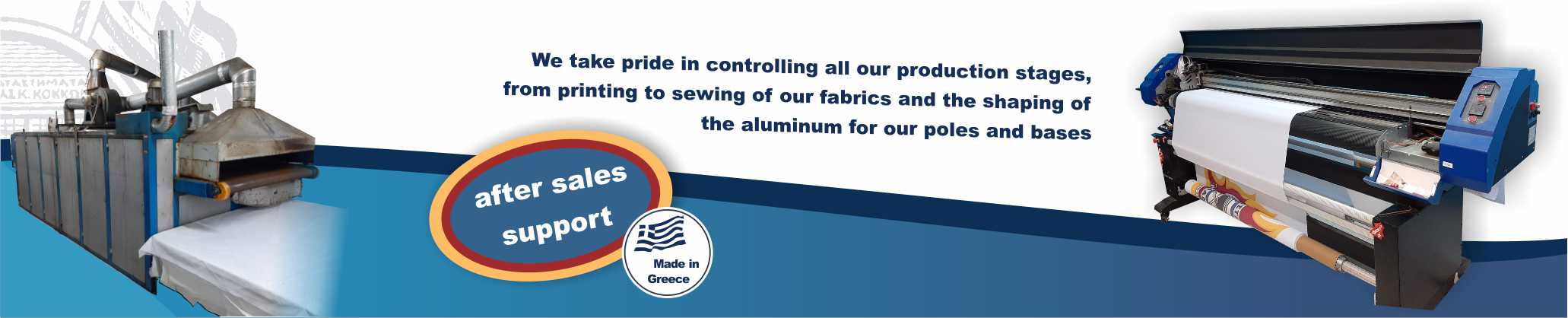 We take pride in controlling all our production stages, from printing to sewing of our fabrics and the shaping of the aluminum for our poles and bases.